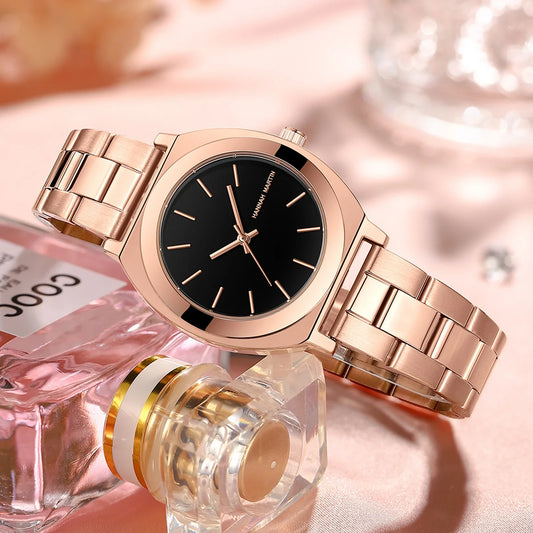 Relógio de Quartzo em Aço inoxidável com Pulseira Ouro Rosé e Tela Preta