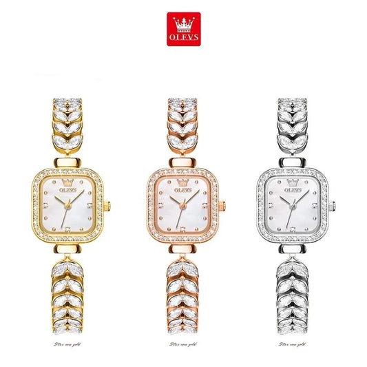 Relógio Feminino Quadrado Estilo Fashion em Aço Inoxidável com Pedras Banhado a Ouro