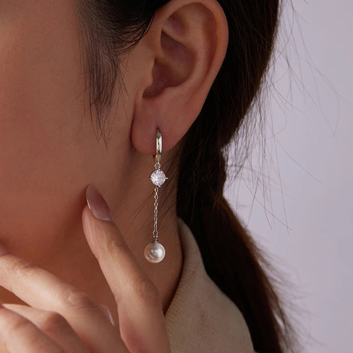 Este brinco é uma composição harmoniosa de elementos clássicos e modernos: uma delicada argola com uma única zircônia cintilante que capta a luz, dando início a um movimento gracioso. Dela pende uma elegante corrente fina que desce com fluidez, culminando em uma pérola que repousa suavemente, adicionando um toque de mistério e requinte.
